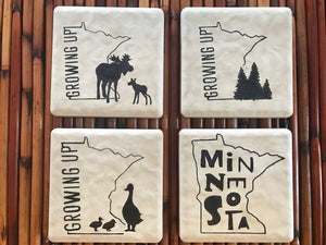 Growing up Minnesota Ceramic Coaster, Set of 4 unique designs. moose, duck and pine tree